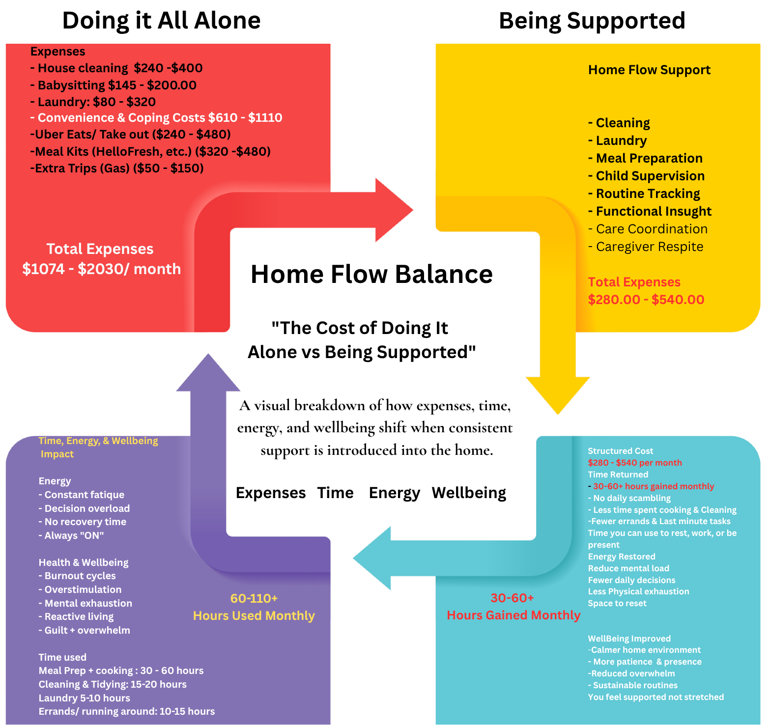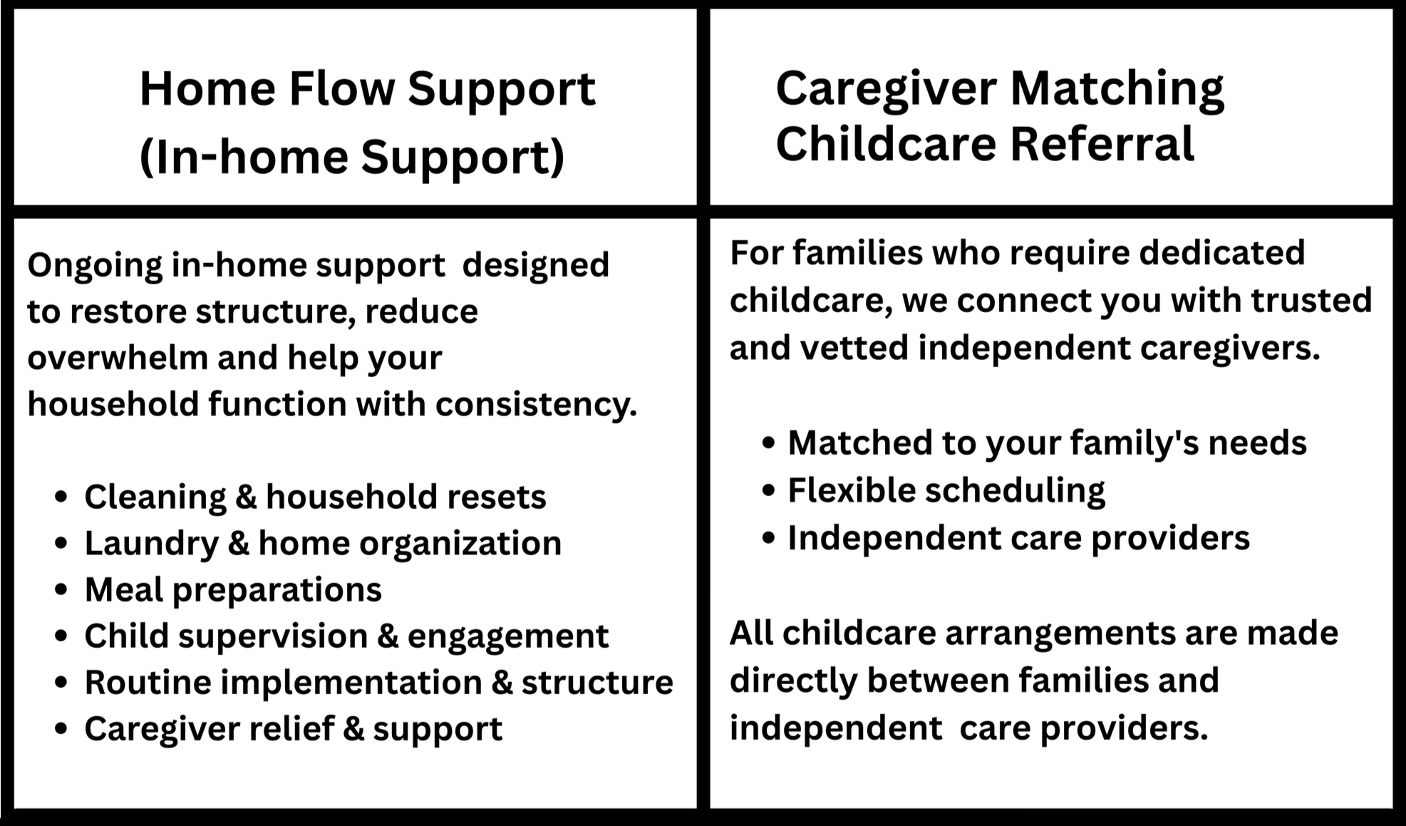 We provide structured in-home support that restores home flow, reduces overwhelm, and helps your home run with calm, consistency and stability.